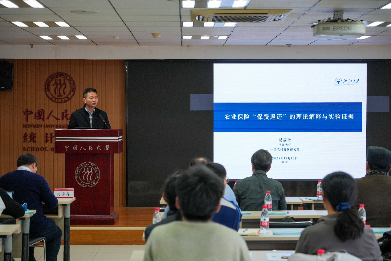 牛浩报告题目为“财政补贴压力与特色农产品保险发展的理论机理与实证检验”。报告指出特色农产品保险顶层设计不断完善,特色农业经济地位凸显,但存在保险发展显著落后于产业规模的问题,包括覆盖率与保障度失衡、高运营成本下供给不足、产品设计与风控短板、农户投保意愿不足。报告指出,财政补贴压力会显著抑制特色农产品保险发展并通过两条路径传导,一是预算编制原则挤压保险政策空间,二是补贴激励不足弱化市场资源配置效率。报告最后提出建议,如何在财政压力既定下优化补贴资金。第一阶段优化存量,基于跟踪分析识别可降低补贴比例与产品费率险种,释放资金空间;第二阶段精准增品,将结余资金优先保障潜力险种,提升资金效能。